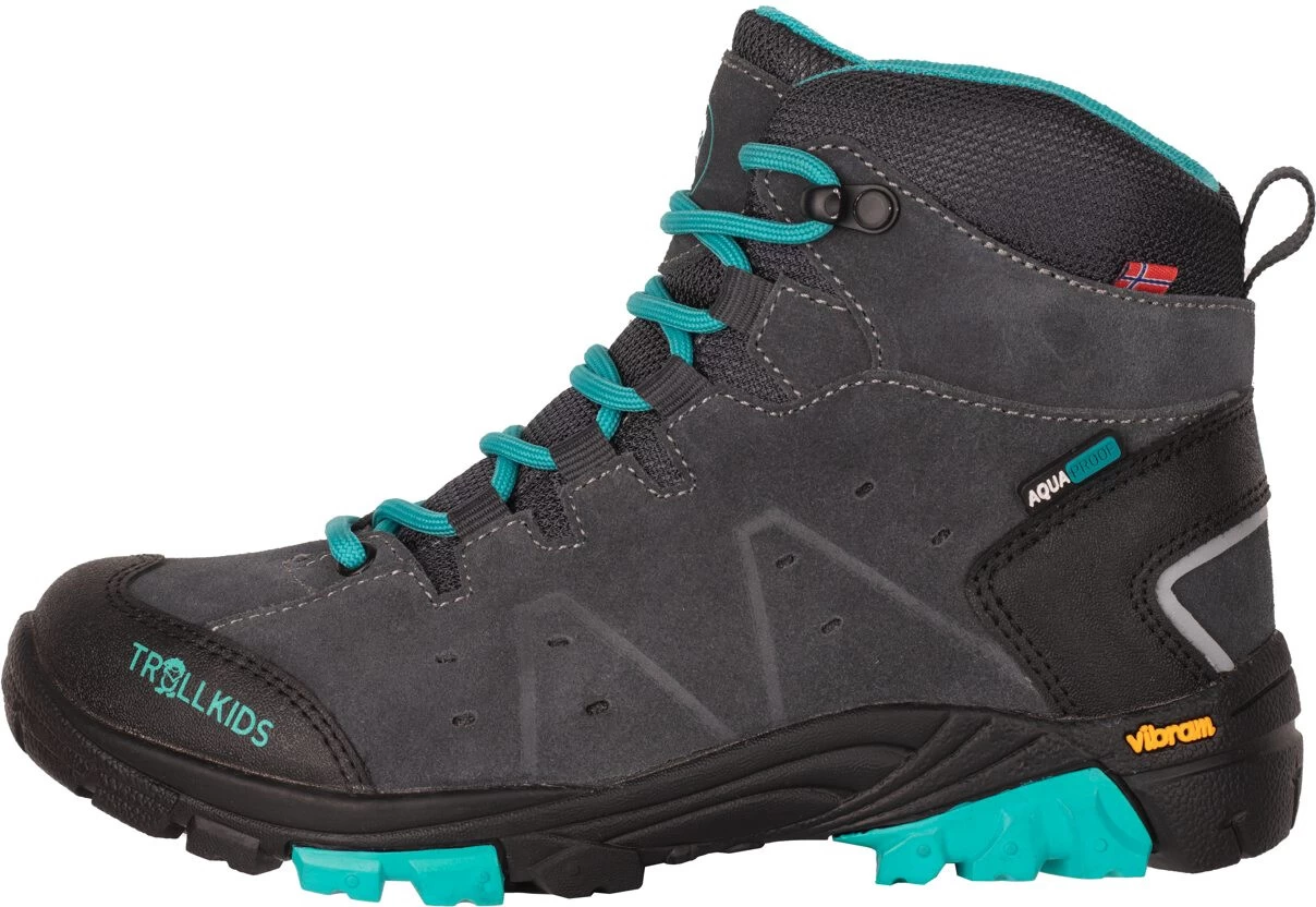 Of het nu de weg naar school is of een winterwandeling: Deze waterdichte, enkelhoge wandelschoen laat in het koude jaargetijde niets te wensen over en de afwerking doet niet onder voor hoogwaardige schoenen voor volwassenen. De Kids Trollsteinen Hiker Mid combineert de voordelen van leer met die van textielmaterialen. De buitenkant is grotendeels gemaakt van suède, terwijl de tong en de voering van polyester zijn. Dankzij het Aquaproof membraan is de schoen volledig waterdicht en wordt vocht snel naar buiten afgevoerd. Verstevigingen aan de hiel en tenen dragen bij aan de stevigheid, en reflecterende inzetstukken aan de achterkant verhogen de zichtbaarheid. De geprofileerde Vibram zool zorgt voor de nodige grip. Materiaal: 80% leer, 15% textiel; 5 % rubber; Tong: 100% Vibram rubber; Voering: 100 % polyester